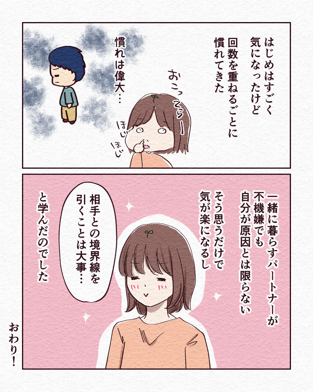 子どもの頃から相手の機嫌は自分がなんとかしないと思っていたのですが、夫にほっといてほしいと言われて、夫がして欲しいことを私はしてる。と思うようになってから気持ちが楽になりました!