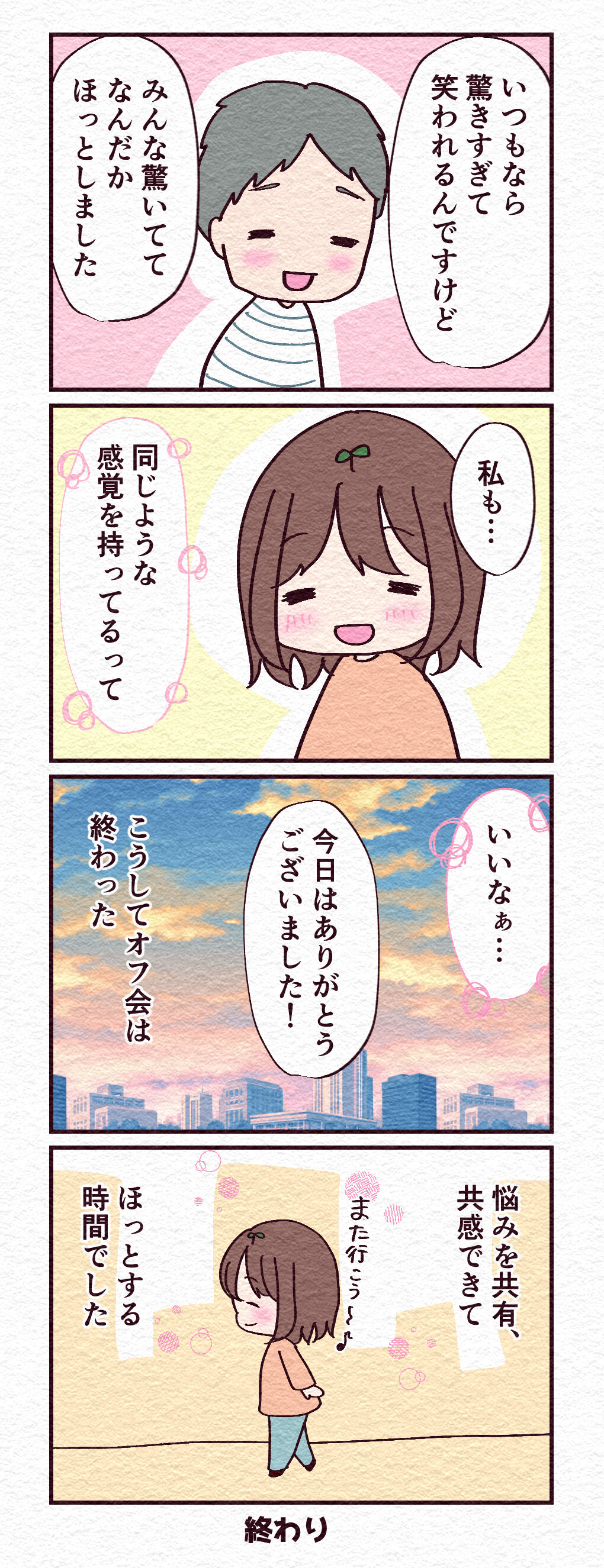 HSPさんのオフ会に参加した話【6】最終回 2023年02月05日 17:40 前回のお話はこちら 貴重な経験をしてとても勉強になりました☺️ 読者登録するとLINEで更新通知が届きます♪最新話がすぐに読めます😆登録してくれたらめっちゃ嬉しいです✨ 「長編エッセイ漫画」カテゴリの最新記事 < 前の記事次の記事 > コメント コメント一覧 (2) 1. りんご系 2023年02月05日 19:39 めちゃくちゃ音に驚いちゃう事を共感して貰えるのって最高🥲🥲 リアクション大きすぎとか言われるけど、ガチで心臓ドクドクなんよー!!!😑 0 pumira_comic がしました 2. ぷみら 2023年02月08日 20:03 >>1 共感していただきとても嬉しかったです〜🥹✨ 0 pumira_comic がしました コメントフォーム 名前 コメント 記事の評価 リセット リセット 顔 星 情報を記憶 コメントを投稿する