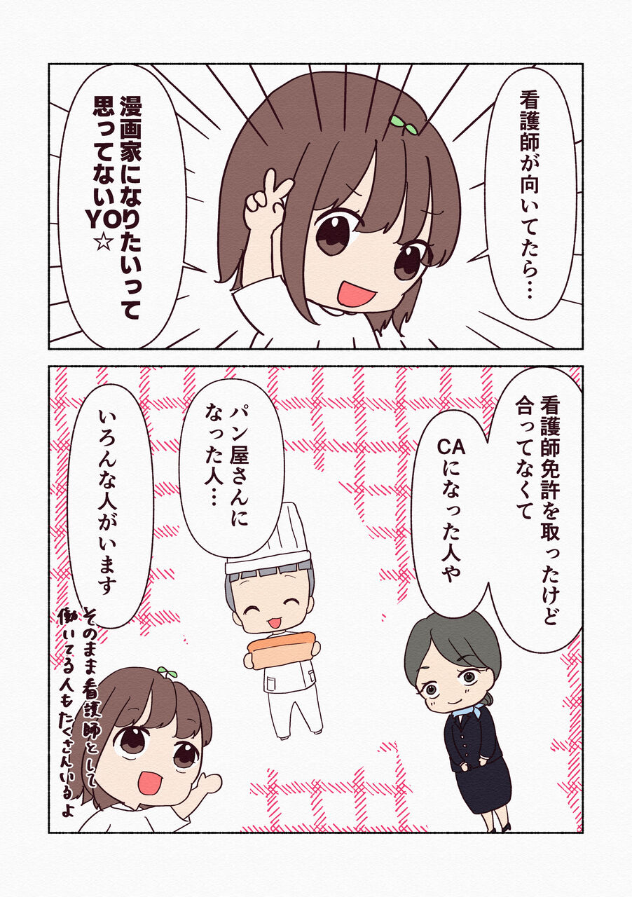 看護師になれるか不安です…【質問コーナー】 2023年07月03日 17:44 時々この質問をいただくので漫画にさせていただきました!他の道もある、と心の片隅にあるだけで、気持ちのしんどさは変わるんじゃないかなと思っています☺️次の質問はこちら! 読者登録するとLINEで更新通知が届きます♪最新話がすぐに読めます😆登録してくれたらめっちゃ嬉しいです✨ カテゴリなしの他の記事 < 前の記事次の記事 > コメント コメント一覧 (6) 1. かか 2023年07月03日 17:57 私は栄養士の免許を持っていますが 実際に栄養士として働いてみたら自分には 合っていないと思い辞めましたが 最初は罪悪感はありましたが辞めた事で自分が得意な事や苦手な事を改めて考える事が出来ました! また栄養士の免許を持っている知人の中にはお菓子作りが好きでケーキ屋に就職する人もいます! 0 pumira_comic がしました 3. ぷみら 2023年07月04日 17:26 >>1 そうなのですね!^^実際働いてみないと自分にあっているかは分かりませんよね!自分の得意と苦手を改めて考えるって大事ですよね✨ 0 pumira_comic がしました 2. 辞めるのは 2023年07月03日 21:29 いい事だよ 新しいスタートに向けて準備するって事 辞めてはいけないという 思考から解放されたら 苦しむ人も減ると思うよ 0 pumira_comic がしました 4. ぷみら 2023年07月04日 17:26 >>2 本当にそう思います! 0 pumira_comic がしました 5. rila 2023年07月06日 11:46 ふと目に留まりましたので、コメントを。医療職をしています。 わたしの知り合いにも医療職からパイロットになった人、医療職資格を取ったあと機械整備士で働いて医療職に戻った人、資格だけはとって研究者になり海外で働いている人さまざまです。違う職種から大学に入り直して医療職につきずいぶん年下の先輩から指導されている方の姿もみかけますよね。 続けることでだんだん覚悟が決まる方、ある日突然覚悟(家族の病気とか💦)で覚悟を決めなくてはいけなくなる方、さまざまなケースがあるかと。どんな道を選ぼうが、なにか覚悟を決めて進まないといけない段階が来るかとおもいます。でも、やり直しは効きます!応援してます。 0 pumira_comic がしました 6. ぷみら 2023年07月07日 16:42 >>5 価値観も環境もその時々で変わりますもんね🥺やり直しはきくということをわかるだけで、心が軽くなる人はいるんじゃないかなと思います!とても素敵なコメントをありがとうございました!⭐️ 私も頑張ります!☺️ 0 pumira_comic がしました コメントフォーム 名前 コメント 記事の評価 リセット リセット 顔 星 情報を記憶 コメントを投稿する