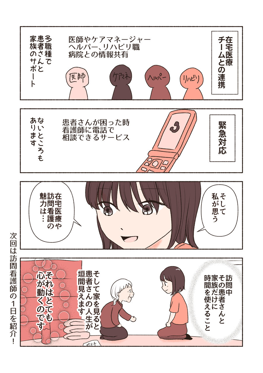 家ではできないケアや処置もありますが、病院の看護ケアと根本は変わらないです