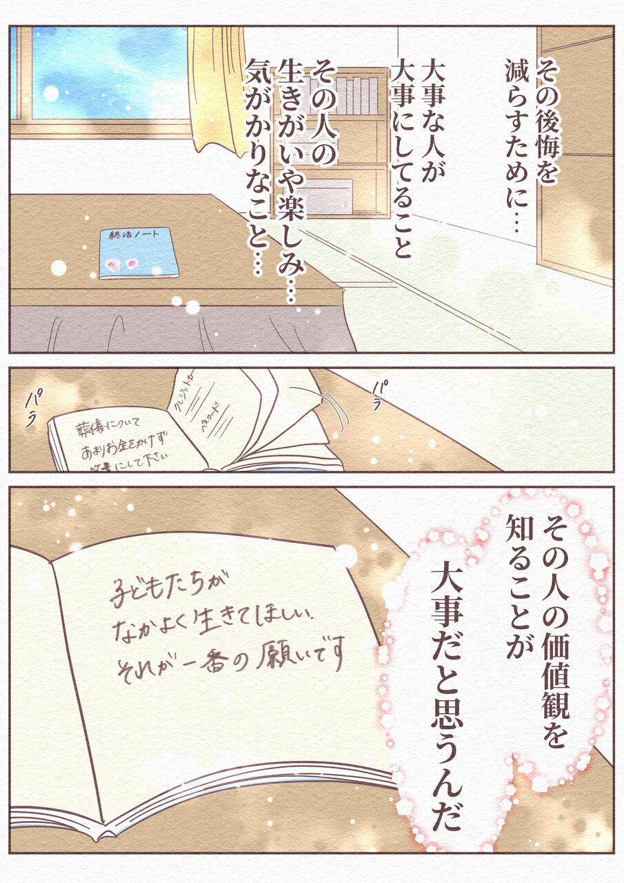 このお話を通して私が伝えたかったのは、本人が自然に逝きたいと願っていても、叶わないケースがあるということ、そして残された家族の気持ちは揺れ動くということです